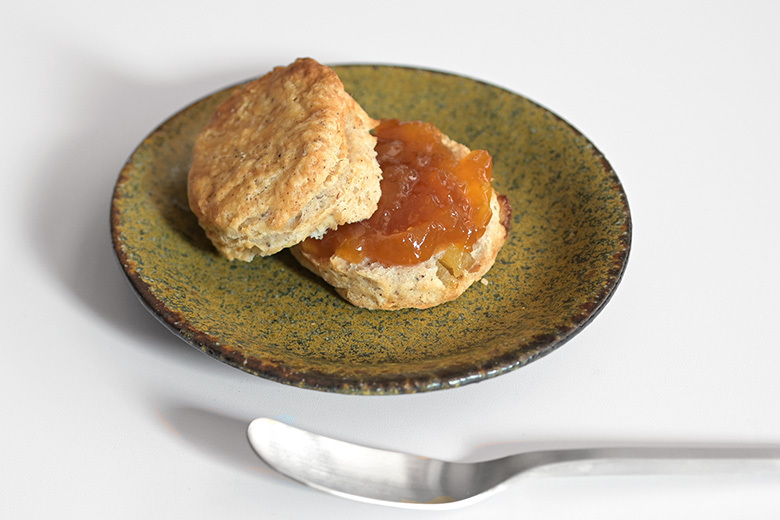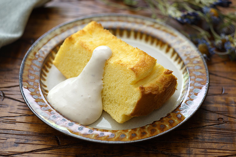 切片後的海鹽戚風再烤過一次,增加蛋糕的焦香味。而與它搭配的奶油也採用最簡單的口味、以品嚐蛋糕原味。