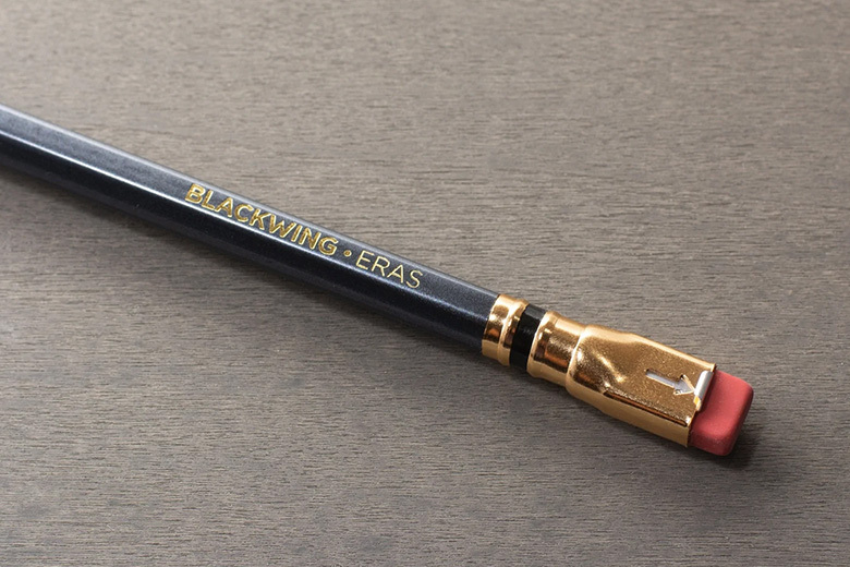 此次的版本更接近十週年的灰色筆桿,還有上個世紀的Blackwing 602,同樣於橡皮擦槽處有個箭頭,表示橡皮擦槽可推出更換的創新設計。