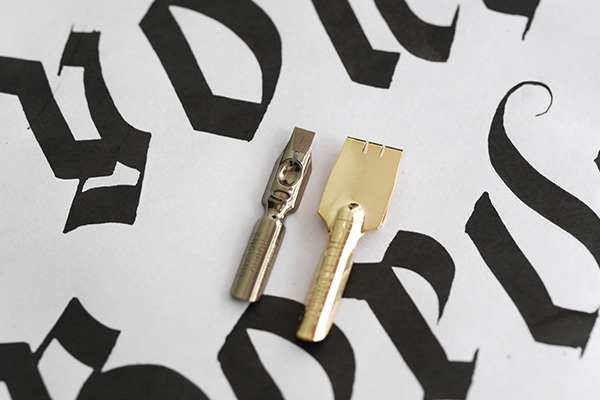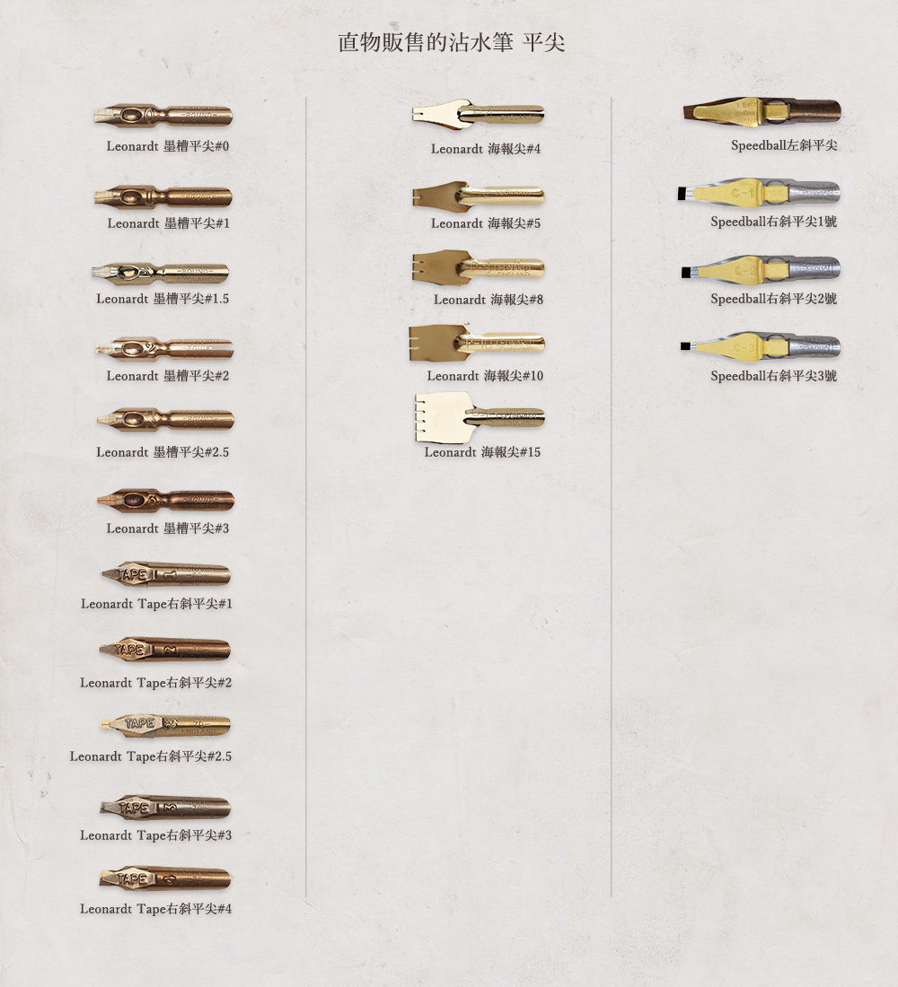 平尖可寫哥德體(Gothic script)、斜體(Italic script)、羅馬圓體等,特殊尖則可用來繪製飾線等用途。