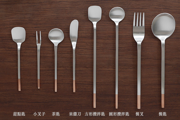 銅的質樸、銀的優雅,兩相結合之下顯示出新的感覺,各種用途的叉子與湯匙等符合日常用餐所需。