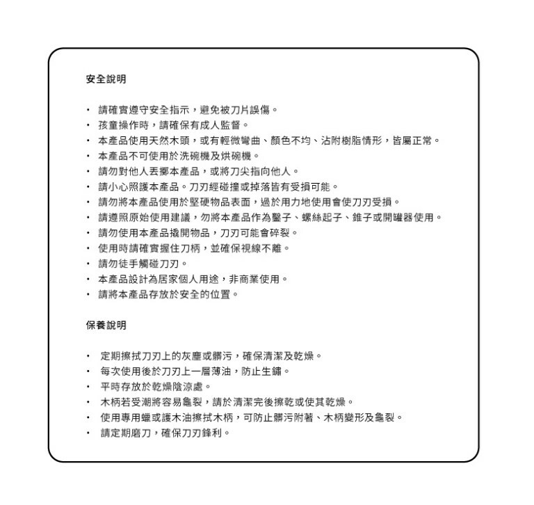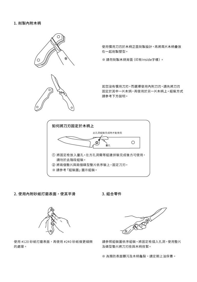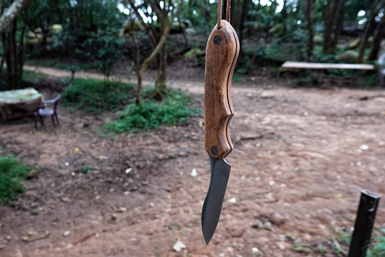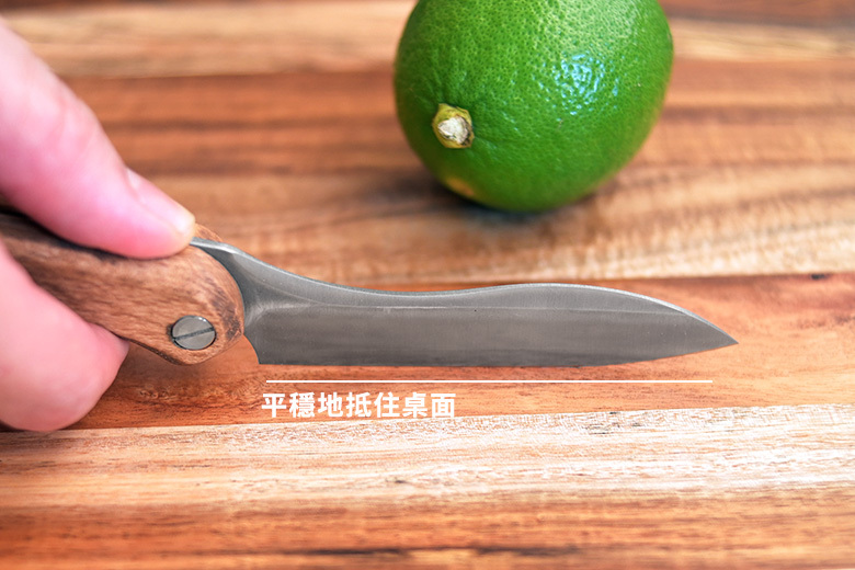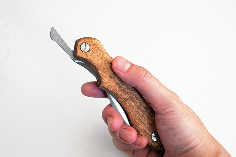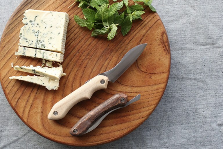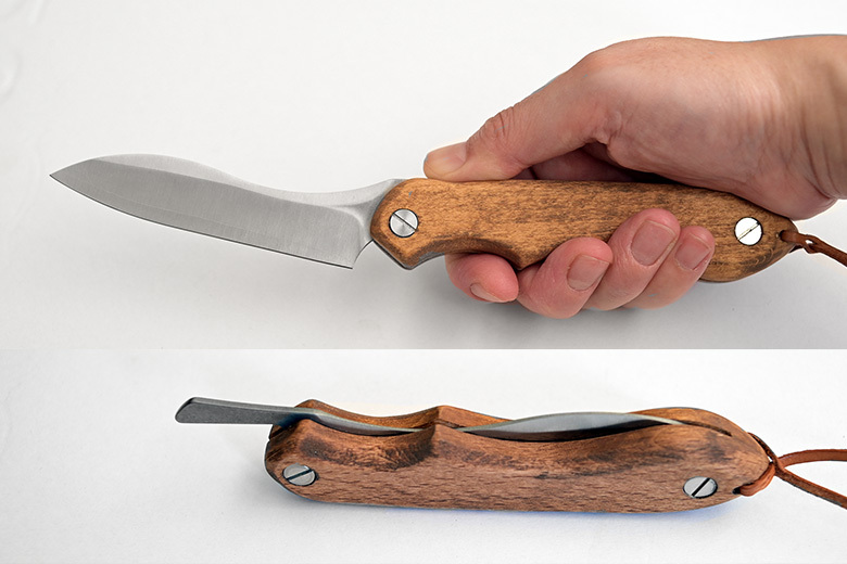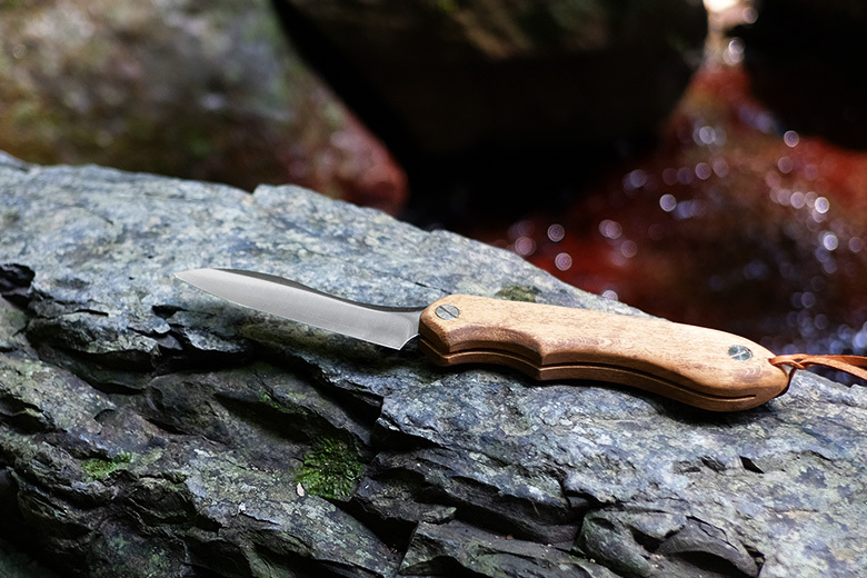 設計成也能在從事戶外活動時作為料理食物使用、夾層鋼的刀鋒採青紙材質、夾住青紙鋼的兩側金屬則使用不鏽鋼。