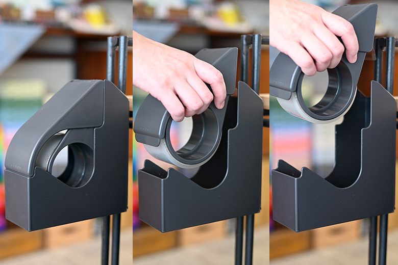 將收納盒磁吸在工作櫃上或是桌邊,降低因亂放而找不到的機率,提高工作效率!膠台本體輕盈好切割,封箱作業十分順手。