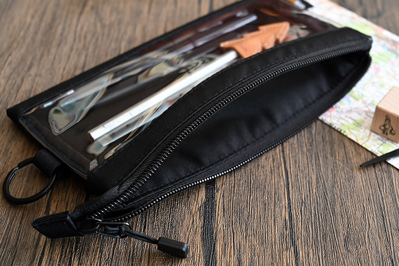 透明視窗能一覽無遺收納內容物品,不只能當筆袋,也能放些化妝品、充電線,大開口的設計拿取東西時方便輕鬆,窄邊還有一個金屬環,加上常用的手機帶就可吊身上做為隨身小包使用或掛於背包上。