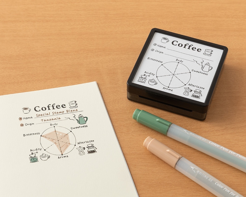 蓋在筆記本上可以用來記錄咖啡的名稱、產地與風味走向圖。無論咖啡豆研磨咖啡,或是在咖啡廳遇到的喜愛口味,都能留下各種咖啡體驗的紀錄。非常適合咖啡愛好者使用的印章。