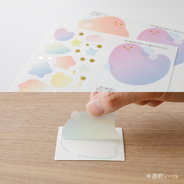 每張都有軋型,大張的半透貼紙可沿著裁切虛線一張張撕下,方便攜帶出門使用。它的離型紙背面印有方格的輔助線,讓書寫訊息時不會寫歪。※書寫時建議使用細字油性筆。
