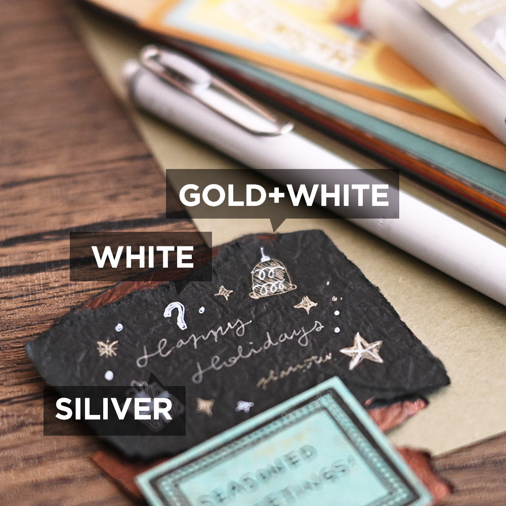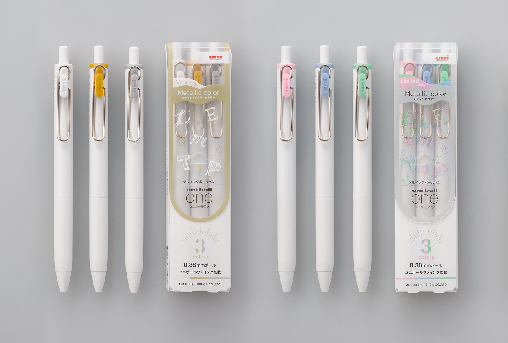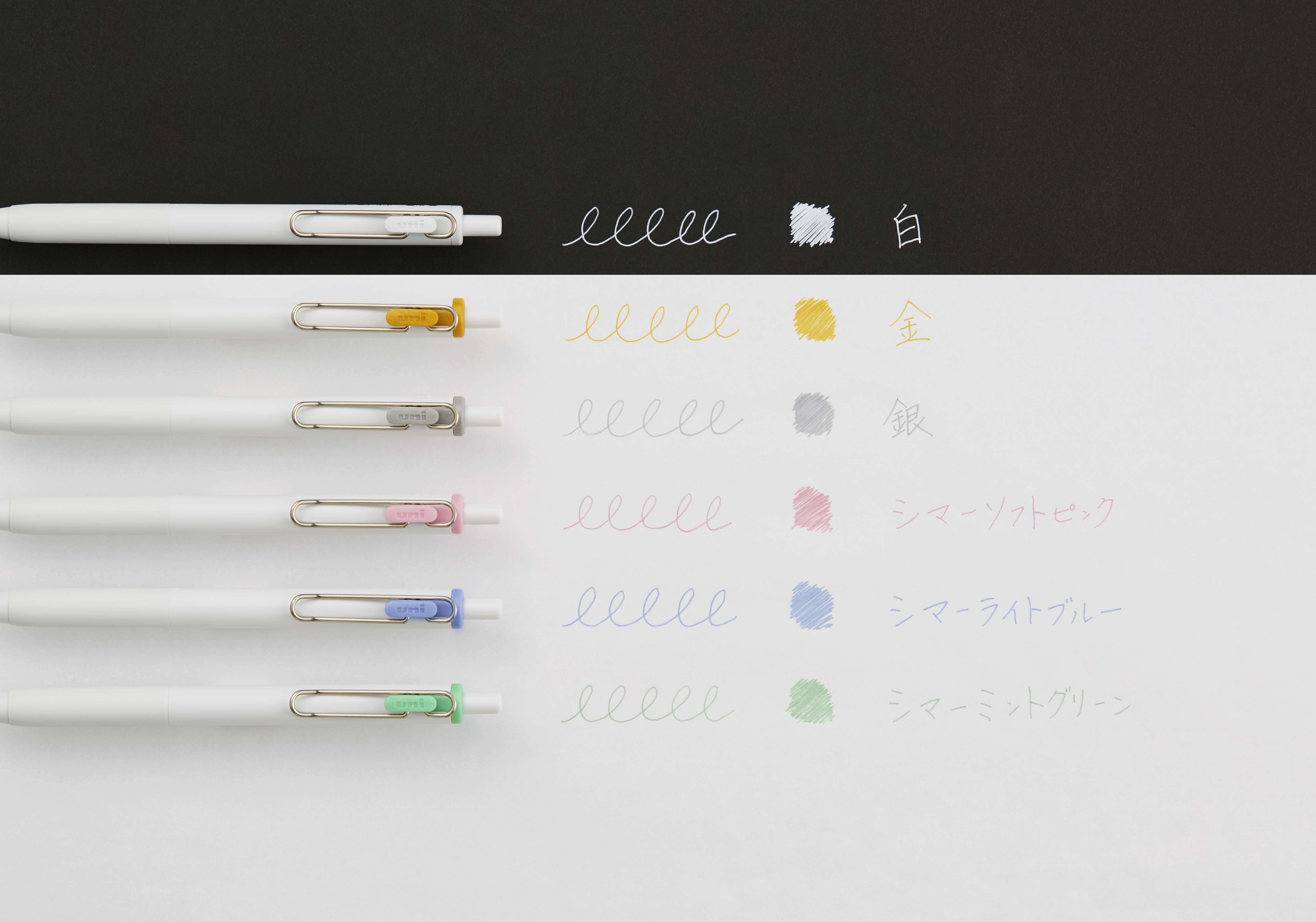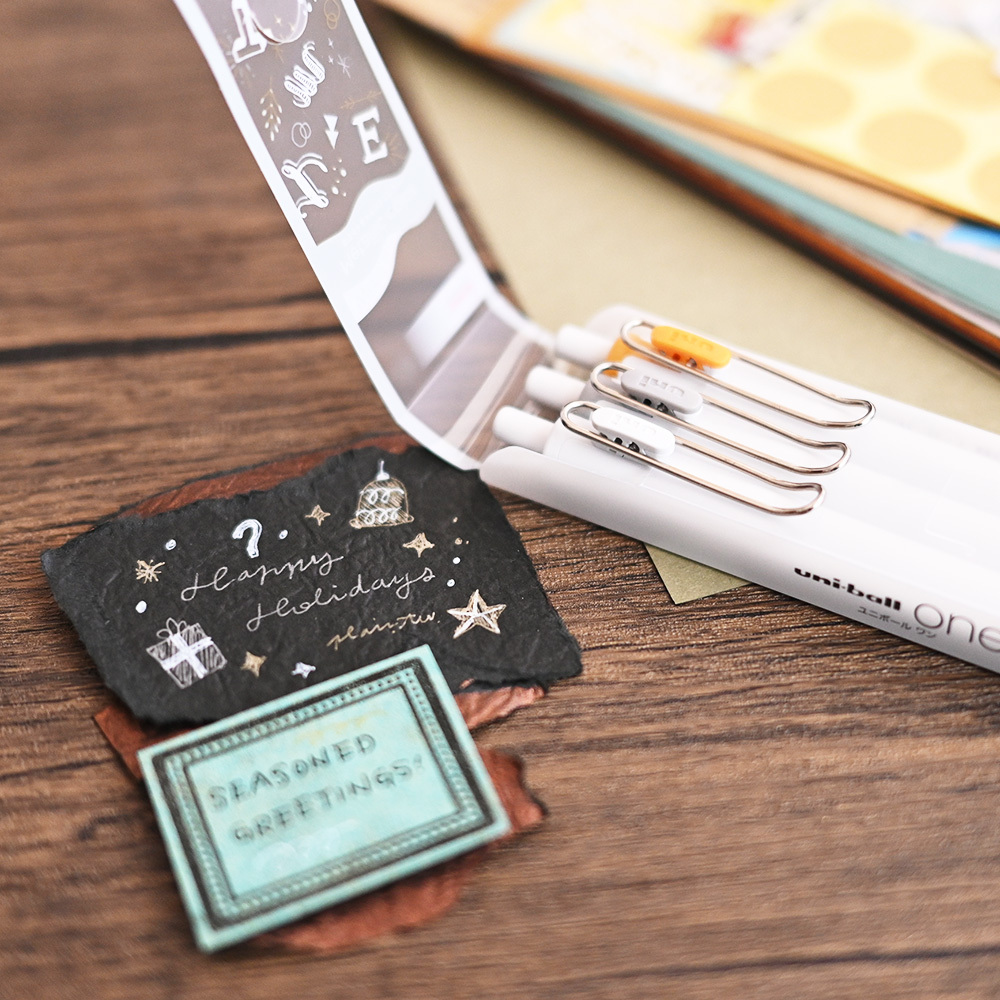 Uni-ball One首次推出白色、金屬色柔和光澤的金色、銀色,三色搭配很適合節慶時書寫卡片。
