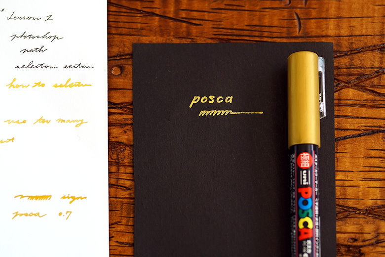 Posca是三菱的招牌商品,書寫在深色紙上飽和且金粉細緻,我們目前引進金、白二色,寬度極細0.7mm。