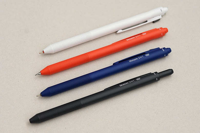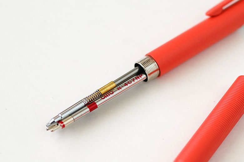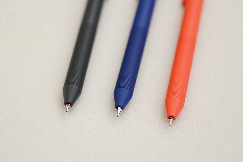 極細的筆桿、霧面的純色烤漆,重鎚切換紅、黑、0.5自動鉛筆三種筆芯,職場或讀書時皆可勝任。