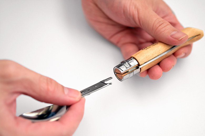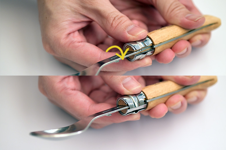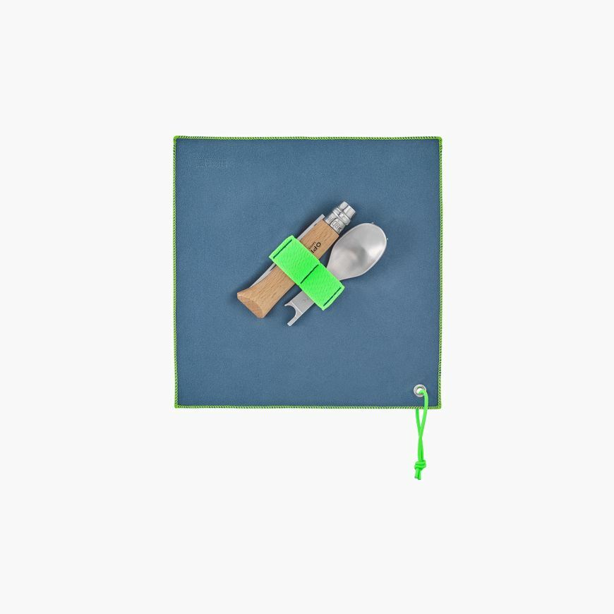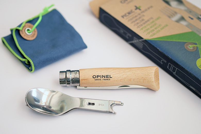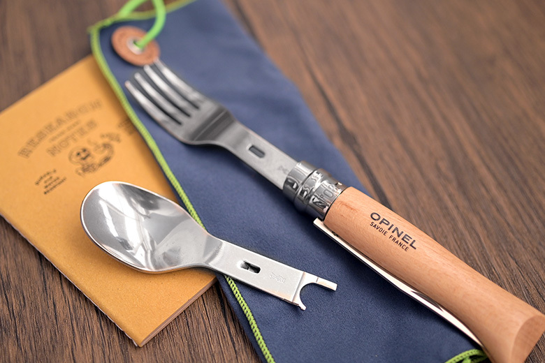 輕便的用餐組合,包括湯匙、叉子、收納用微纖維布,餐具可輕鬆組合在NO.8折刀上