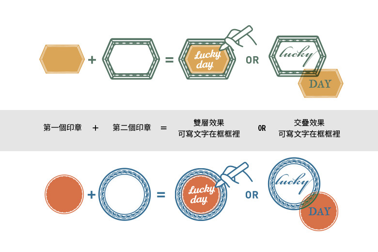 活用你手邊的各色印台,每款各有4顆透明印章,可以組合使用或單獨使用。