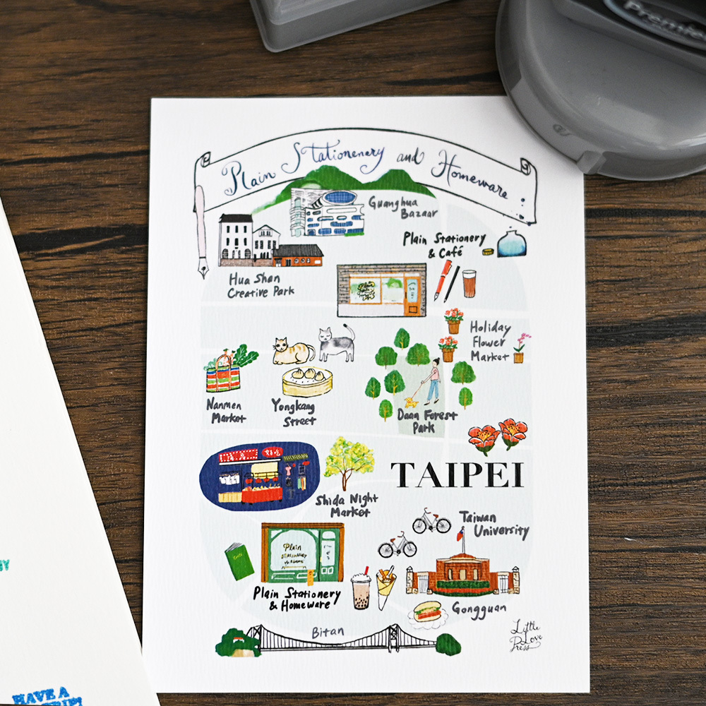 台北地表上許多有趣的事物、都一併濃縮在這個縮小版場景地圖上,有明信片、貼紙二種。