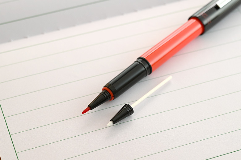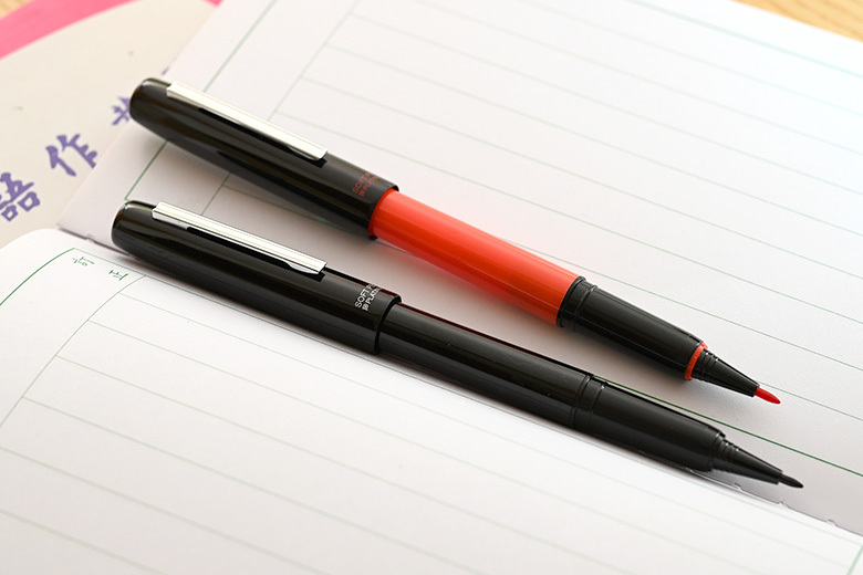 由卡式墨水供墨(使用白金規格吸墨器)。朱紅筆桿搭配黑色筆蓋的組合實在是蠻可愛的,與某款著名鋼筆的配色類似。