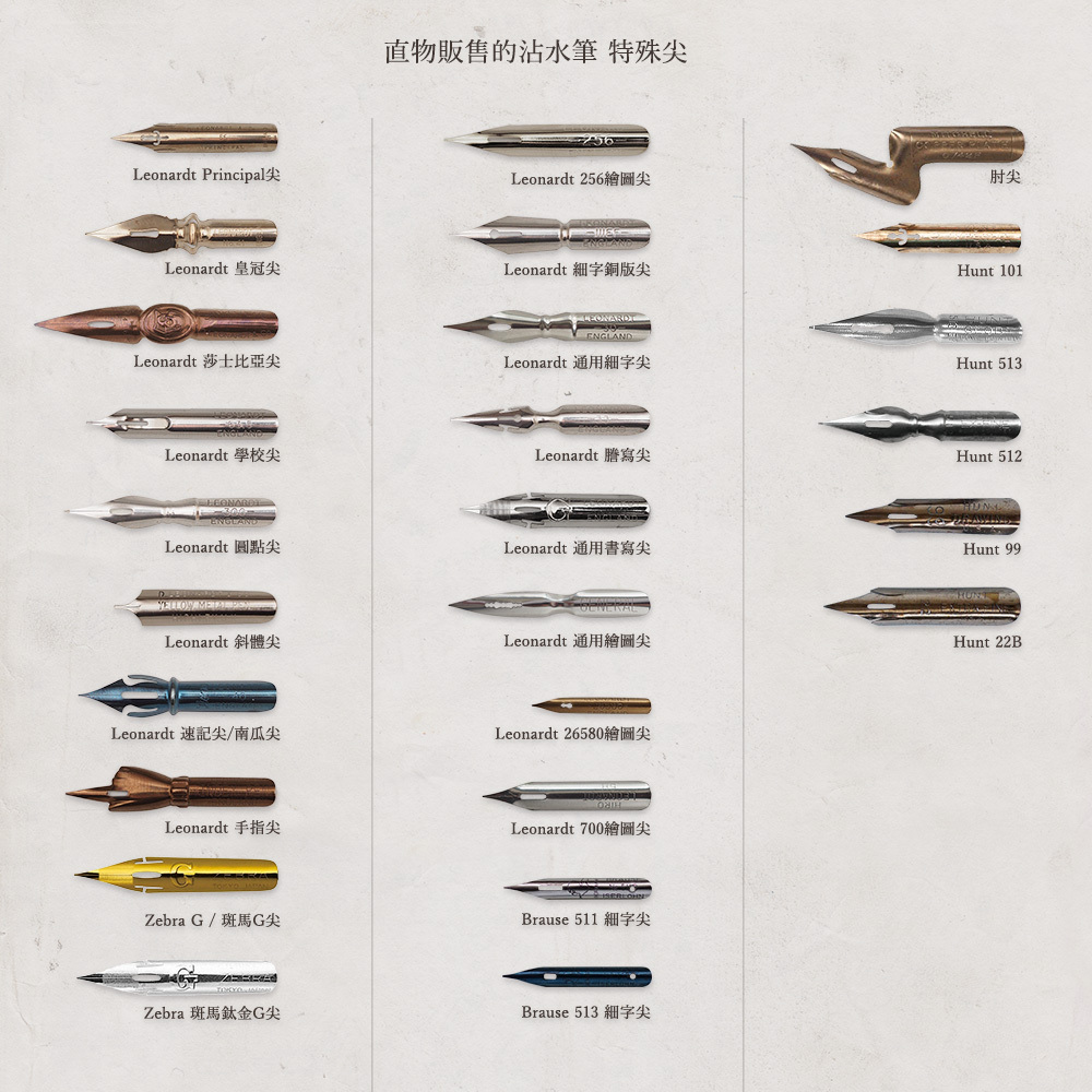 目前由直物所引進的沾水筆尖涵蓋世界上主要的筆尖品牌,包括英國的D. Leonardt & Co.、德國的Brause以及美國的Speedball (Hunt)。Leonardt (李奧納德)是沾水筆尖製造老鋪,從1856年以來就開始生產沾水筆尖至今、也曾為義大利國王製造筆尖。由於Leonardt生產的筆尖種類繁多、甚至也復刻已絕版的古董筆尖,多樣化的選擇讓Leonardt成為英文書法者的愛好品牌。