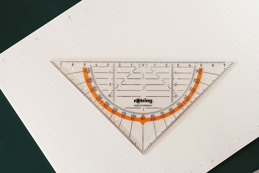 採用高透明度塑膠材質製作,具有三角板與量角器功能,且量角器的刻度兩個方向都有,反向刻度還特別加上顏色以便視認,無法彎曲使用。