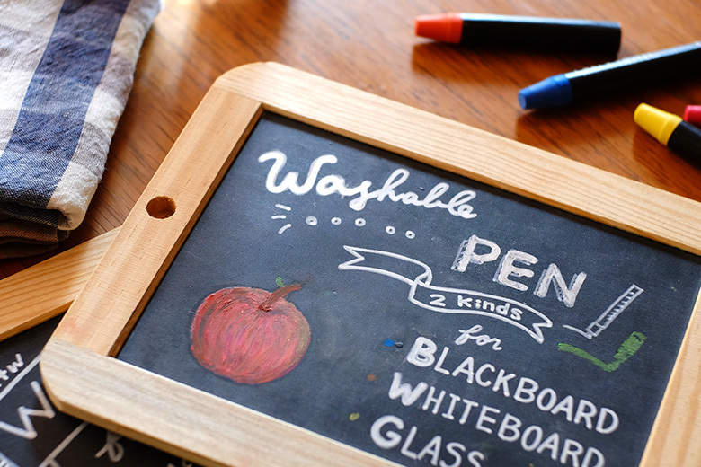 採用頁岩石板製作,具空白、格線二面,建議搭配可擦拭的黑板筆,字跡清晰,或蠟筆組產生深淺的繪畫效果。