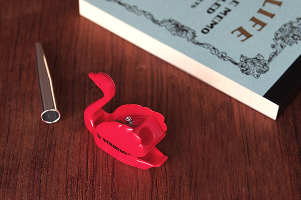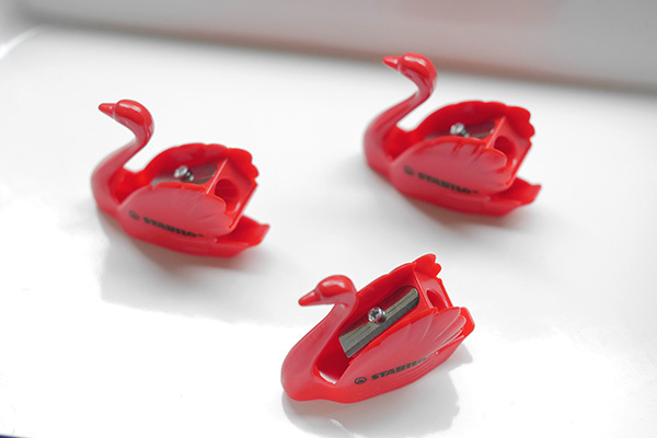 以經典天鵝商標為造型、搭配該公司的紅色標準色,設計出這個天鵝造型的削鉛筆器。