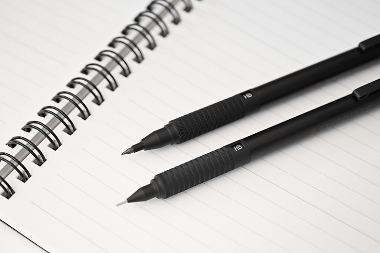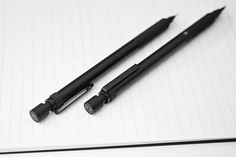 筆身採用鋁製霧黑色、低重心設計,階段式的瘦長設計有較好視野,2.0款為漸進式出芯,十分方便,日本製造。