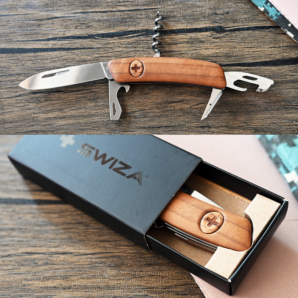 由瑞士知名鐘錶製造商 SWIZA 開發,一把刀中具備多樣小工具,核桃木握柄手感舒適。