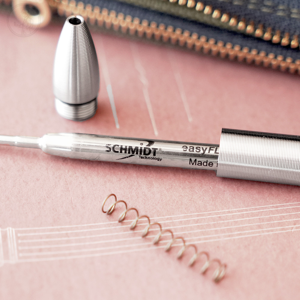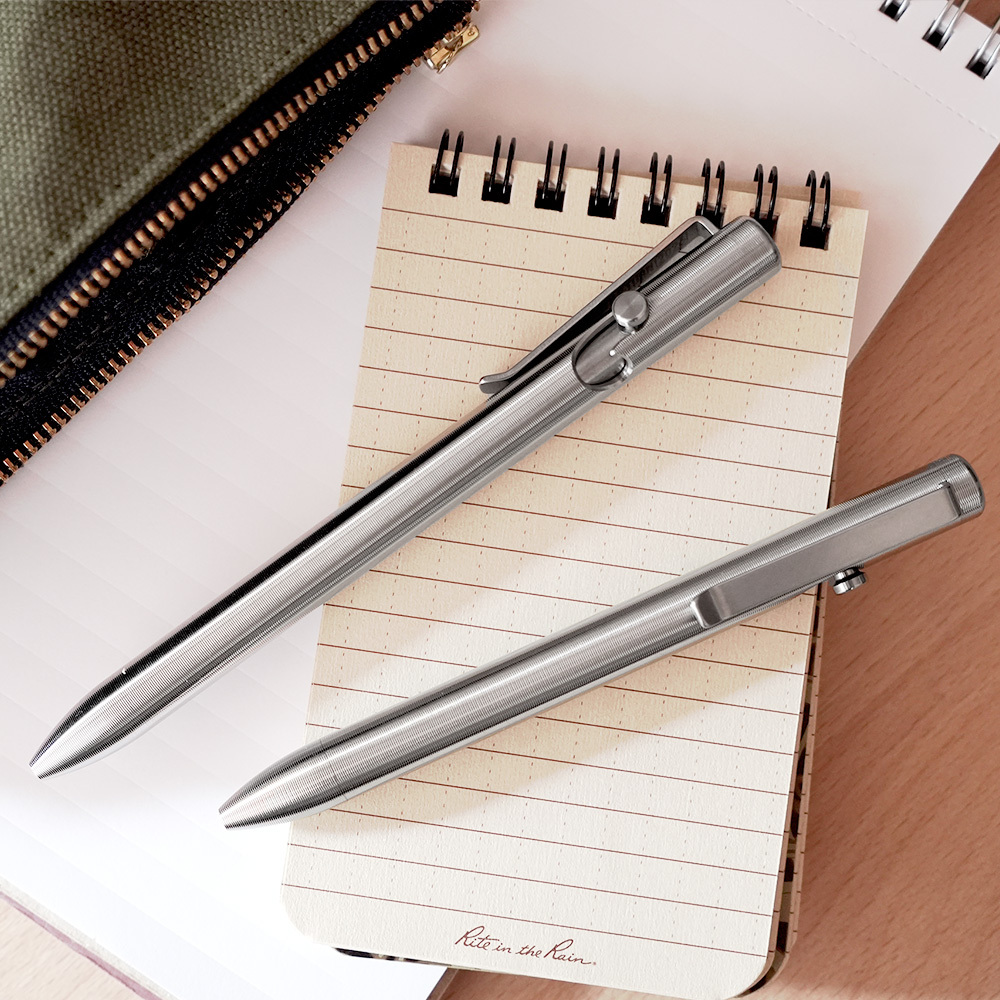 鈦金屬筆身搭配精密切削的鈦金屬筆夾,按壓機構是戰術筆常見的Bolt-Action,派克G2規格筆芯。