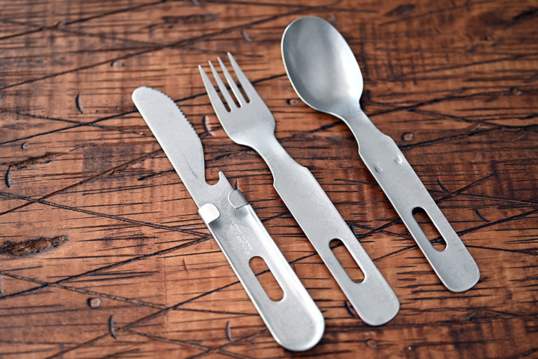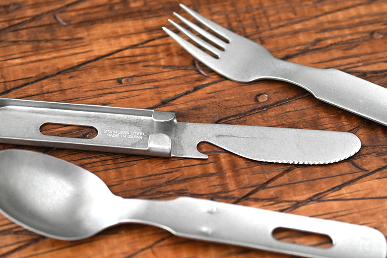 Outdoor味十足,湯匙、叉子、刀子、開瓶器四合一的便攜組,露營或平日做為日用餐具也可符合需求,日本製造。