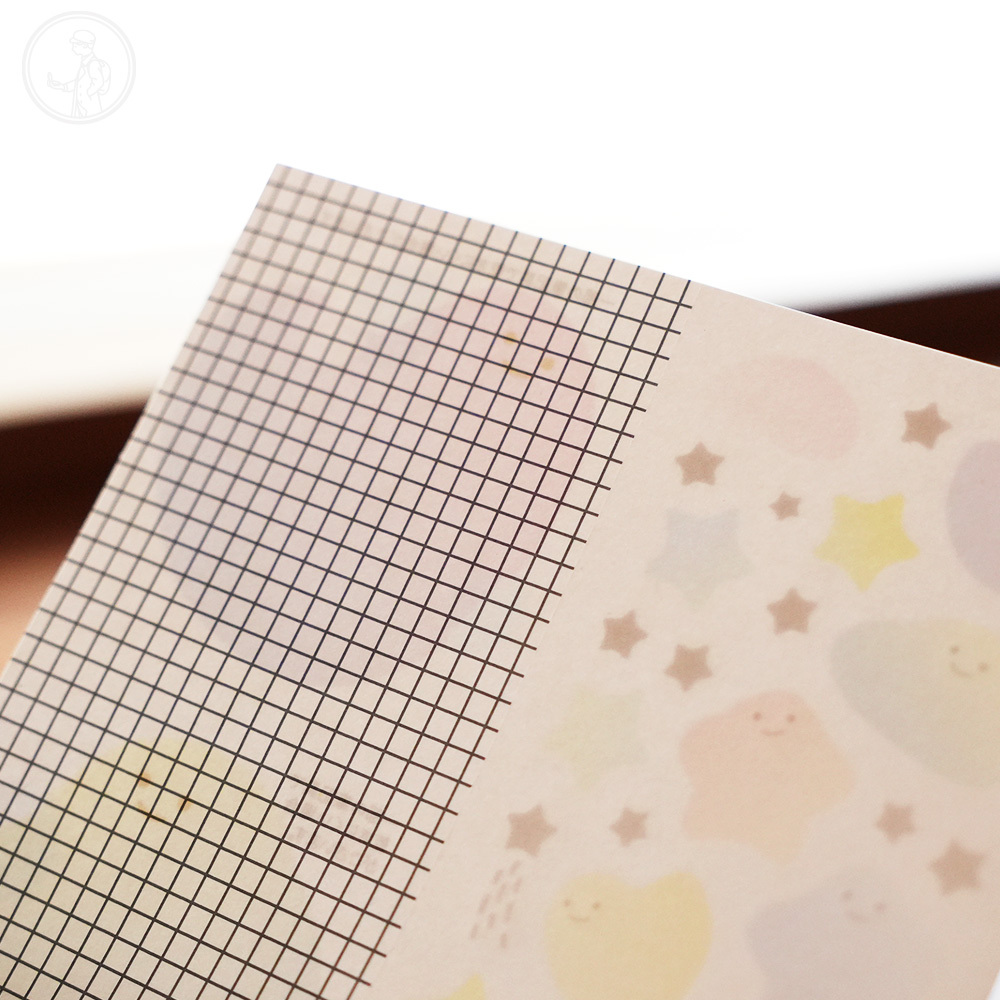 大張貼紙的離型紙背面印有方格的輔助線,可以先書寫再撕下,讓書寫訊息時不會寫歪。※書寫時建議使用細字油性筆。