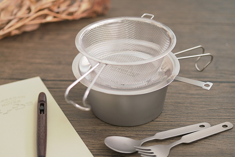 採用輕量的鈦製成,具有質輕堅硬、不易變形生鏽的優點,保養容易且易攜帶,露營、登山皆適宜。日本燕市製造。